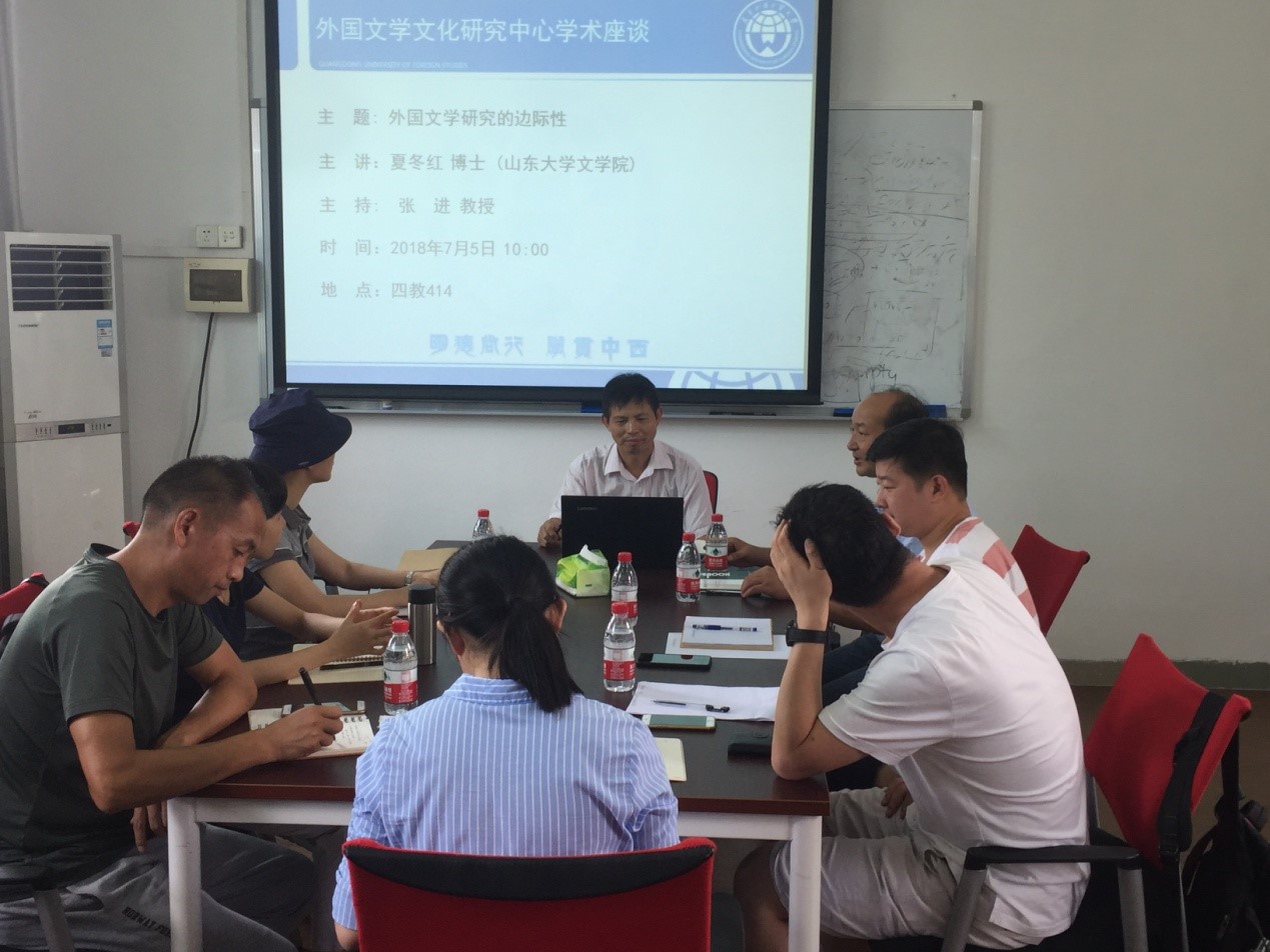7月5日上午10点,山东大学文学院夏冬红博士到访中心,并在四教414与中心师生就外国文学研究的“边际性”问题展开了一场学术座谈。活动由中心主任张进教授主持,中心许栋梁博士及博士生近十人参加。