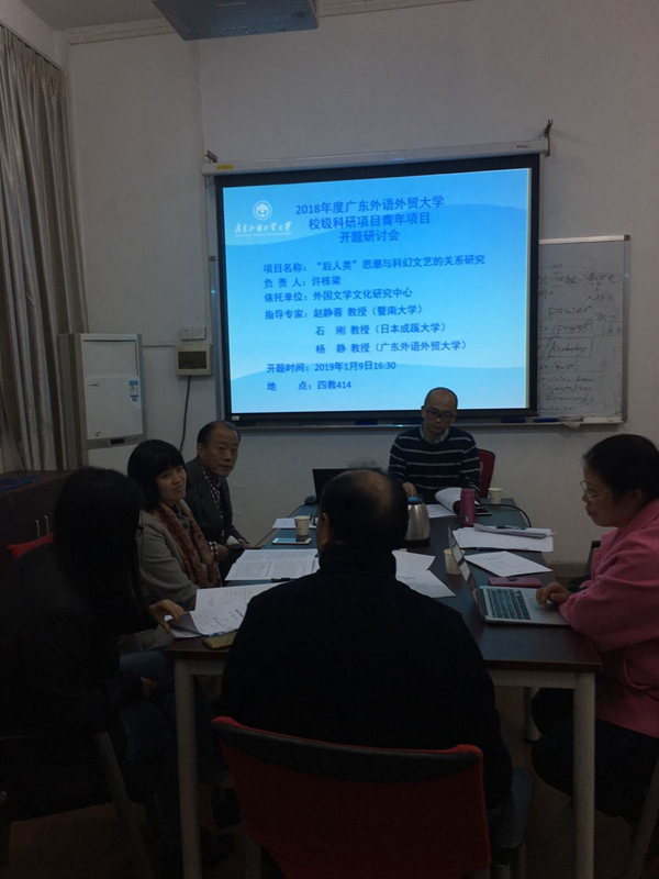 2019年1月9日16:00-19:00,中心在四教414组织了2018年度校级科研项目开题研讨会。此次研讨会指导专家包括:暨南大学中文系主任赵静蓉教授、日本成蹊大学石刚教授、广东外语外贸大学英文学院杨静教授。各项目负责人、项目组成员,外国文学文化研究中心主任张进教授及部分青年教师、博士后,中心“比较文化研究”博士点部分在读博士生等参加研讨会。