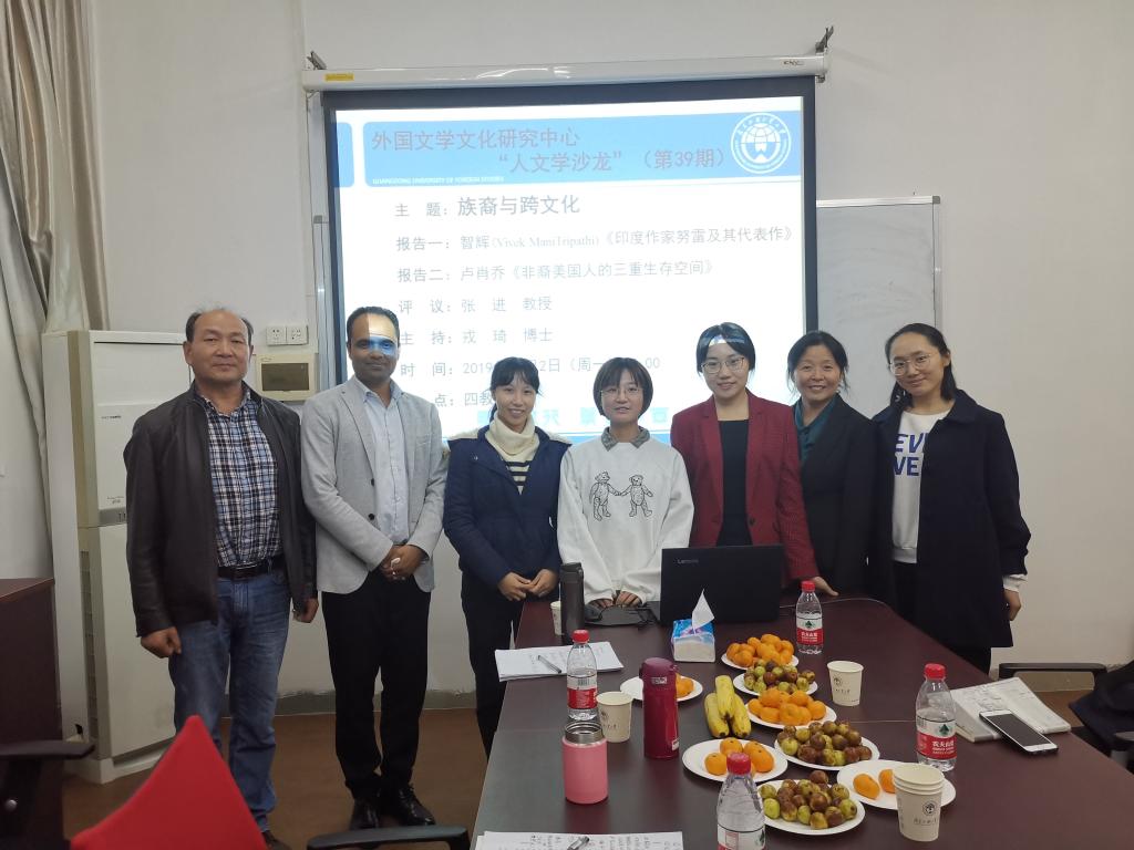 2019年12月2日15:00,第39期“人文学”沙龙在四教414举行。本次沙龙主题为“族裔与跨文化”,由博士生、日语亚非学院印地语老师智辉(Vivek Mani Tripathi)和博士生卢肖乔做报告,张进教授担任评议嘉宾,戎琦博士担任主持人。中心雷晓敏教授、李日容博士、许栋梁博士和访问学者及博士生参与了此次沙龙。