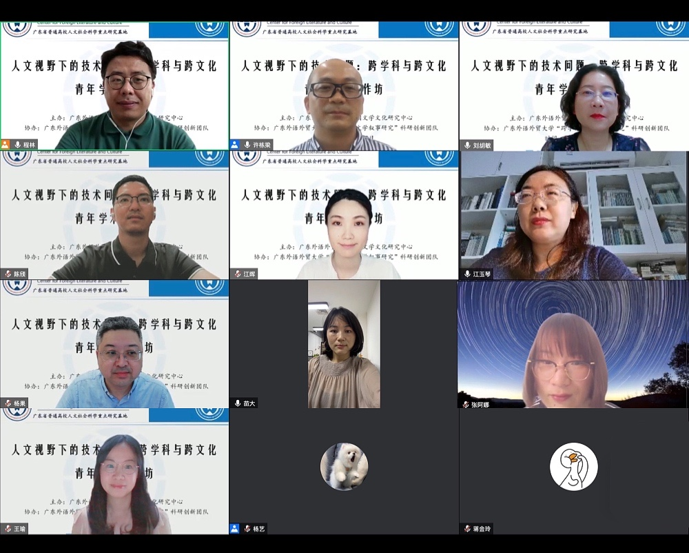 5月30日,由中心主办、我校“跨学科的文学叙事研究”科研创新团队协办的“人文视野下的技术问题:跨学科与跨文化”青年学术工作坊在线上举行,共有来自中山大学、华南师范大学、深圳大学、南方科技大学、广州大学、广东外语外贸大学等高校的8位青年学者出席,共进行了一场主旨报告和三组主题发言。中心主任张进教授、我校英文学院副院长、“跨学科的文学叙事研究”创新团队负责人刘胡敏教授出席并致辞,中心及校内外多名硕博研究生参与交流。