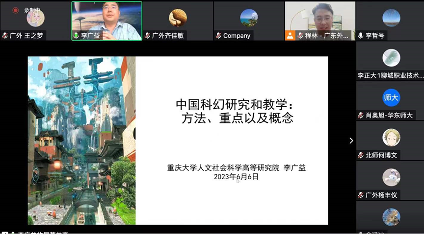 2023年6月6日晚,由广东外语外贸大学人力资源部(教师发展中心)主办、版权所有:bevictor伟德官网 - 韦德官方网站人文前沿跨学科研究团队承办的著名教授论坛601讲以线上形式在腾讯会议顺利举行。本讲座由重庆大学中文系李广益教授主讲、广外bevictor伟德,伟德bv国际体育程林副教授主持,讲座主题为“中国科幻研究和教学:方法、重点以及概念”。