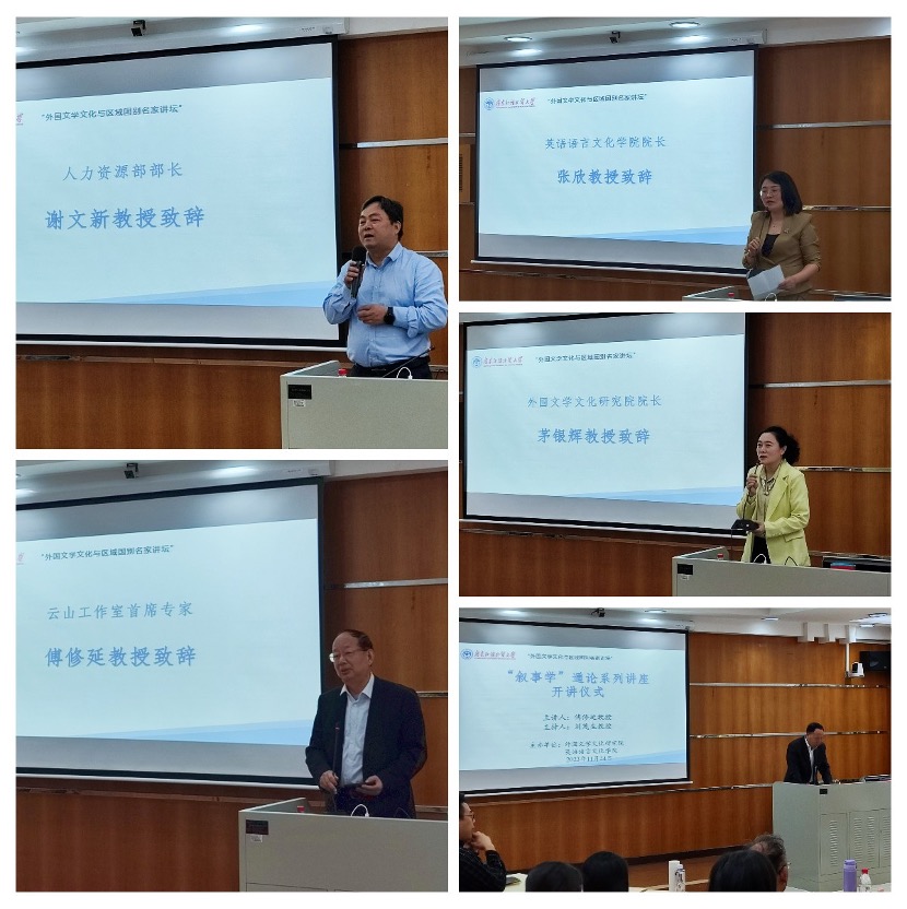 11月24日下午,“名家讲坛”第二讲“叙事学”通论系列讲座在白云山校区第九教学楼丝纺讲堂举行了开讲仪式。活动由bevictor伟德,伟德bv国际体育副院长刘茂生教授主持,党委教师工作部、人力资源部部长、教师发展中心主任谢文新研究员,英语语言文化学院院长张欣教授,bevictor伟德,伟德bv国际体育院长茅银辉教授,以及第二讲主讲嘉宾傅修延教授分别致辞。